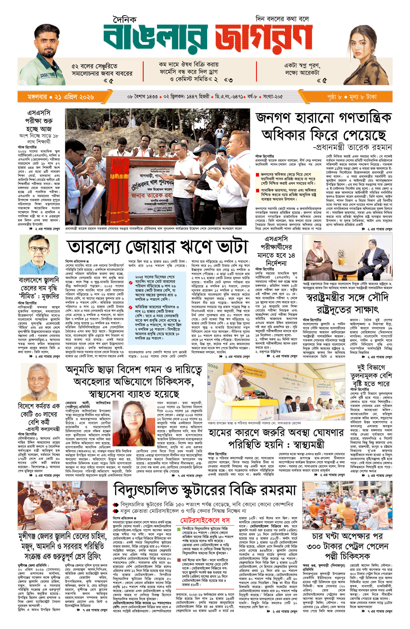 রাষ্ট্র ও সমাজে ন্যায়বিচার প্রতিষ্ঠায় বর্তমান সরকার বদ্ধপরিকর বলে জানিয়েছেন প্রধানমন্ত্রী তারেক রহমান। সোমবার (২০ এপ্রিল) নিজ জেলা বগুড়ায় ই-বেইলবন্ড কার্যক্রমের উদ্বোধনকালে তিনি এ কথা বলেন। প্রধানমন্ত্রী হিসেবে দায়িত্ব গ্রহণের পর এটিই তার প্রথম বগুড়া সফর। এর আগে, প্রধানমন্ত্রী বগুড়া বিস্তারিত...