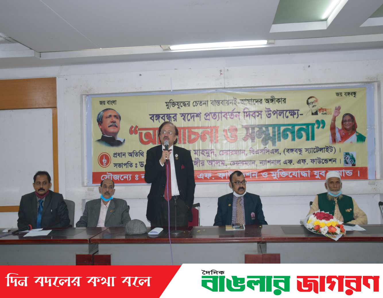স্টাফ রিপোর্টার :: বীর মুক্তিযোদ্ধাদের সেবামূলক সংগঠন ন্যাশনাল এফ এফ ফাউন্ডেশনের উদ্যোগে ১১ জানুয়ারি সকালে জাতীয় প্রেসক্লাবের ভিআইপি লাউঞ্জে নারী বীর মুক্তিযোদ্ধাদের সংবর্ধণা ও বঙ্গবন্ধুর স্বদেশ প্রত্যাবর্তন দিবস উপলক্ষে আলোচনা সভা অনুষ্ঠিত হয়। ন্যাশনাল এফ এফ ফাউন্ডেশনের চেয়ারম্যান ড. এস এম জাহাঙ্গীর আলমের সভাপতিত্বে অনুষ্ঠানে প্রধান অতিথি ছিলেন বাংলাদেশ স্যাটেলাইট কোম্পানী লিঃ এর চেয়ারম্যান ড. শাজাহান মাহমুদ। বক্তব্য রাখেন, রুহুল আমিন মজুমদার, আনোয়ার হোসেন ভূইয়া, রুজিনা আক্তার রীনা, নজরুল ইসলাম বাচ্চু প্রমুখ। অনুষ্ঠানে ১০জন নারী মুক্তিযোদ্ধাকে সংবর্ধণা দেওয়া হয়।