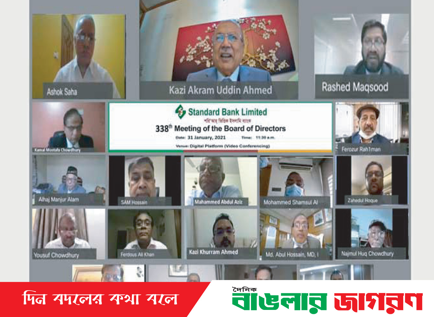 নিউজ ডেস্ক :: স্ট্যান্ডার্ড ব্যাংক লিমিটেড এর পরিচালনা পর্ষদের ৩৩৮তম সভা, ৩১ জানুয়ারি অনুষ্ঠিত হয়। ডিজিটাল প্লাটফর্মে অনুষ্ঠিত উক্ত সভায় সভাপতিত্ব করেন ব্যাংকের পরিচালনা পর্ষদের সম্মানিত চেয়ারম্যান কাজী আকরাম উদ্দিন আহমেদ।