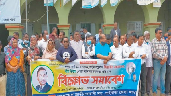 জেলা বিএনপির সাধারণ সম্পাদক মাহামুদুন নবী টিটুলের সভাপতিত্বে বিক্ষোভ সমাবেশে বক্তব্য রাখেন- জেলা বিএনপির সহ-সভাপতি শহিদুজ্জামান শহীদ, সদর থানা বিএনপির আহবায়ক খন্দকার ওমর ফারুক সেলু, জেলা বিএনপির উপদেষ্টা আলমগীর সাদুল্যা দুদু, সাবেক সাধারণ সম্পাদক কামরুল হাসান সেলিম, ফুলছড়ি থানা বিএনপির আহবায়ক সাদেকুল ইসলাম নান্নু, জেলা বিএনপির যুগ্ম সম্পাদক মোকছুদার রহমান চৌধুরী, কোষাধ্যক্ষ পৌর কাউন্সিলর আবু বকর সিদ্দিক স্বপন, সহ-সাংগঠনিক সম্পাদক আনারুল ইসলাম, জেলা যুবদলের সভাপতি রাগিব হাসান চৌধুরী, সাধারণ সম্পাদক আব্দুর রাজ্জাক ভুটটু, জেলা বিএনপির সহ-মৎস্য বিষয়ক সম্পাদক শফিকুল ইসলাম রুবেল, জেলা বিএনপির সহ-শিক্ষা বিষয়ক সম্পাদক কার্জন চৌধুরী, জেলা শ্রমিক দলের সাধারণ সম্পাদক হুনান হক্কানী, জেলা বিএনপির সহ-মানবাধিকার বিষয়ক সম্পাদক মাসুদ রানা, জেলা যুবদলের সাংগঠনিক সম্পাদক খন্দকার জাহেদুন্নবী তিমু, যুগ্ম সম্পাদক খন্দকার ইউনুস আলী দুখু, সহ-সাধারণ সম্পাদক খন্দকার আল আমিন, জেলা ছাত্রদলের সভাপতি খন্দকার জাকারিয়া আলম জিম, সাধারণ সম্পাদক তারেকুজ্জামান তারেক, সদর থানা ছাত্রদলের আহবায়ক ইমাম হাসান আলাল প্রমুখ। জেলা বিএনপি সিনিয়র যুগ্ম সাধারণ সম্পাদক ইলিয়াস হোসেনের সঞ্চালনায় সমাবেশে দলের বিভিন্ন শাখার নেতাকর্মীরা অংশ নেন।