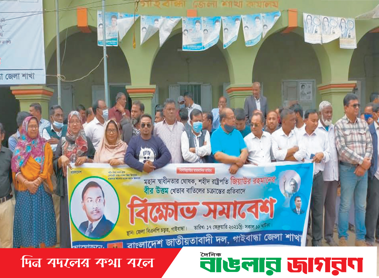 গাইবান্ধা প্রতিনিধি :: জাতীয়তাবাদি দল বিএনপির প্রতিষ্ঠাতা সাবেক রাষ্ট্রপতি জিয়াউর রহমানের রাষ্ট্রীয় খেতাব বাতিলের প্রতিবাদে কেন্দ্রীয় কর্মসূচীর অংশ হিসেবে গাইবান্ধায় বিক্ষোভ সমাবেশ করেছে বাংলাদেশ জাতীয়তাবাদী দল-বিএনপি। বুধবার দলীয় কার্যালয়ের সামনে এ সমাবেশ অনুষ্ঠিত হয়। পরে পুলিশ বাধায় সামাবেশটি শেষ করা হয়।