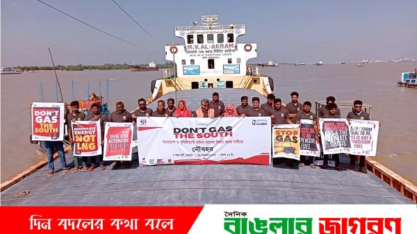 মোঃ নূর আলম, বাগেরহাট মোংলা: বর্তমানে যে হারে ফসিল গ্যাস উত্তোলন করা হচ্ছে তাতে বিশ্বের জলবায়ু লক্ষ্য অর্জনকে বাধাগ্রস্ত করছে। গ্লোবববাল সাউথের দ্রুত অর্থনৈতিক প্রবৃদ্ধির ফলে জ্বালানির চাহিদা বাড়ছে। জ্বালানির বাড়তি চাহিদার বিকল্প হিসেবে ফসিল গ্যাস ব্যবহার বন্ধ করতে হবে। ন্যায্য জ্বালানি রূপান্তর হিসেবে নবায়নযোগ্য জ্বালানিকে বেছে নিতে হবে। জীবাশ্ম জ্বালানির ব্যবহার বিষয়ে প্যারিস চুক্তির সাথে সামঞ্জস্যপূর্ণ নীতিমালা গ্রহণ করে জি-২০ ও কপ-৩০ সম্মেলনের সিদ্ধান্তে তা অন্তর্ভূক্ত করতে হবে। ১৯ নভেম্বর বুধবার সকালে মোংলার পশুর নদীতে বৈশ্বিক কর্মসুচির অংশ হিসেবে নৌবহর এর উদ্বোধনী অনুষ্ঠানে বক্তারা একথা বলেন। বাংলাদেশসহ পৃথিবীব্যাপী ফসিল গ্যাসের বিস্তার বন্ধের দাবিতে এ নৌবহর অনুষ্ঠিত হয়। পরিবেশ ও জলবায়ু বিষয়ক জাতীয় সংগঠন ধরিত্রী রক্ষায় আমরা (ধরা), ওয়াটারকিপার্স বাংলাদেশ ও পশুর রিভার ওয়াটারকিপার এ নৌবহরের আয়োজন করে।