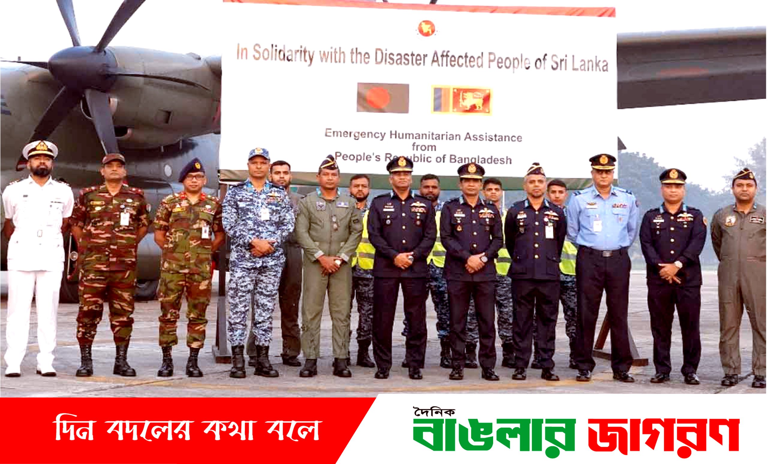 আইএসপিআর আরও জানায়, প্রধান উপদেষ্টার নির্দেশে পররাষ্ট্র মন্ত্রণালয়ের সমন্বয়ের মাধ্যমে সশস্ত্র বাহিনী বিভাগের সার্বিক তত্ত্বাবধানে বাংলাদেশ বিমান বাহিনীর একটি সি-১৩০জে পরিবহন বিমান ক্ষতিগ্রস্তদের মানবিক সহায়তা দিতে আজ বাংলাদেশ বিমান বাহিনীর ১৫ জন ক্রুর একটি দল, সশস্ত্র বাহিনী বিভাগের একজন ও পররাষ্ট্র মন্ত্রণালয়ের একজন প্রতিনিধি প্রয়োজনীয় ত্রাণসামগ্রী নিয়ে শ্রীলঙ্কার কলম্বোর উদ্দেশ্যে যাত্রা করে। বিমান বাহিনীর এয়ার কমডোর মোহাম্মদ সহিদুল ইসলাম মিশন কমান্ডারের দায়িত্ব পালন করেন। প্রায় ১০ টন ত্রাণ সহায়তার মধ্যে রয়েছে তাঁবু, শুকনো খাবার, মশারি, টর্চ লাইট, গামবুট, ভেস্ট, হ্যান্ড গ্লাভস, রেসকিউ হেলমেট ও বিপুল পরিমাণ ওষুধ।