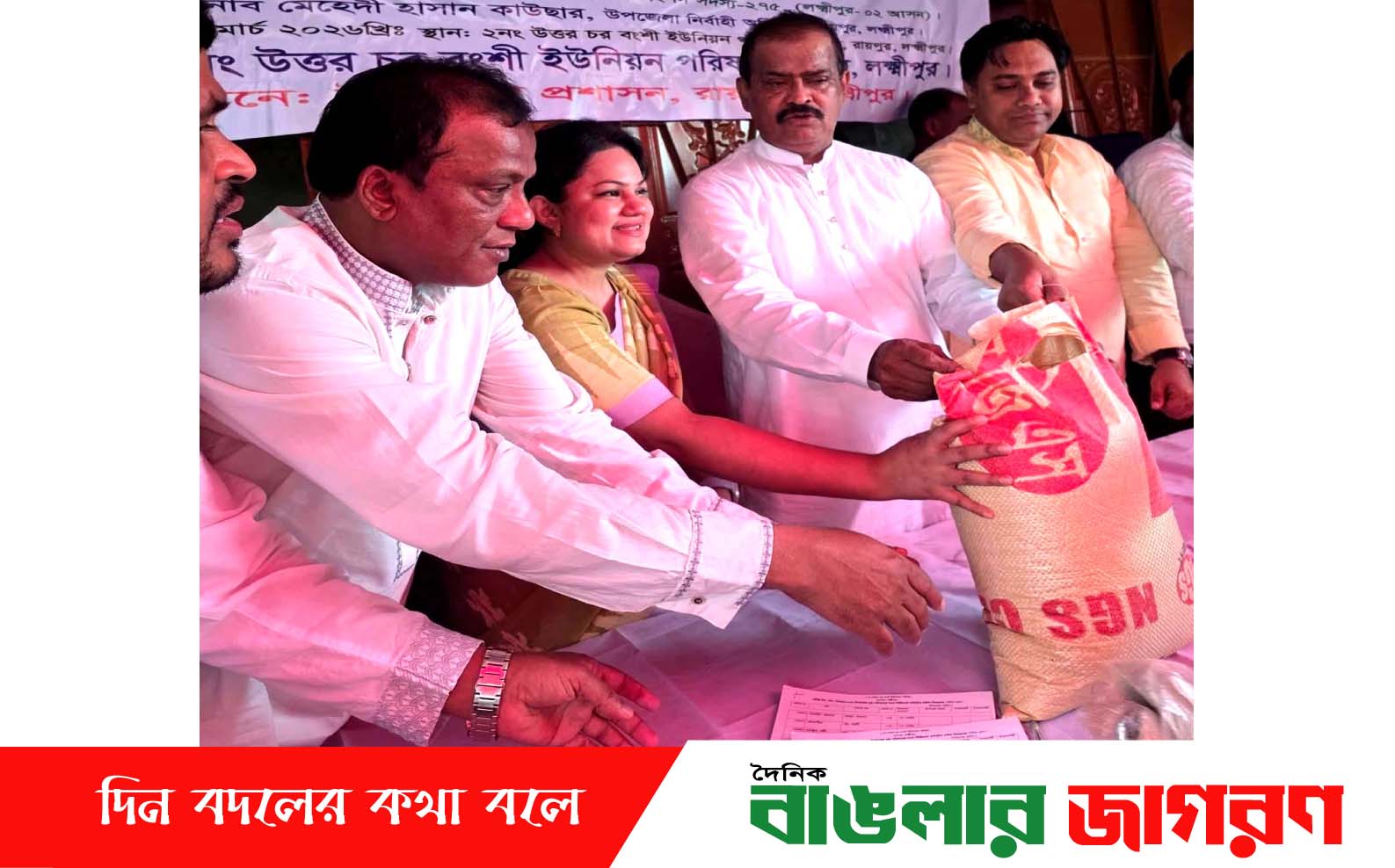 শনিবার ১৪ মার্চ দুপুরে দুর্যোগ ব্যবস্থাপনা ও ত্রাণ মন্ত্রণালয়ের বাস্তবায়নে ও ইউনিয়ন পরিষদ আয়োজিত এ কর্মসূচির আওতায় ইউনিয়নের অসহায় ও নিম্নআয়ের মানুষের মাঝে চাল বিতরণ কার্যক্রমে প্রধান অতিথি হিসেবে উপস্থিত লক্ষ্মীপুর-২ আসনের সংসদ সদস্য আবুল খায়ের ভূঁইয়া।