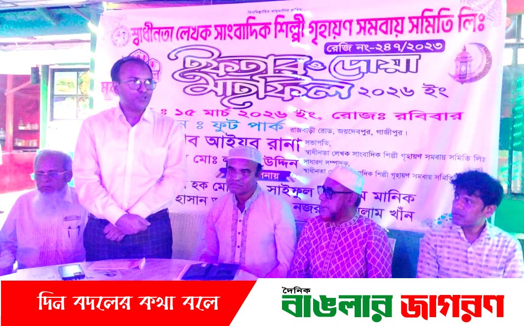 গাজীপুরে স্বাধীনতা লেখক সাংবাদিক শিল্পী গৃহায়ন সমবায় সমিতি লি.-এর উদ্যোগে ইফতার মাহফিল ও আলোচনা সভা অনুষ্ঠিত হয়েছে। রবিবার (১৪ মার্চ ২০২৬) বিকেলে জয়দেবপুর শহরের রাজবাড়ী রোডে ফুড পার্ক রেস্টুরেন্টে এই আয়োজন করা হয়।