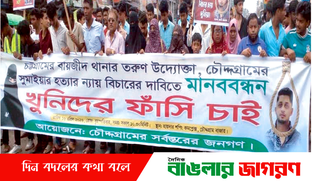 আলোচিত নারী উদ্যোক্তা সুমাইয়া জাহান প্রমি (২২) হত্যার ঘটনায় অভিযুক্ত আসামীদের গ্রেফতার ও দৃষ্টান্তমূলক শাস্তির দাবীতে মানববন্ধন ও প্রতিবাদ মিছিল করেছে কুমিল্লার চৌদ্দগ্রামের বিভিন্ন শ্রেণি পেশার মানুষ। বৃহস্পতিবার (১৬ই এপ্রিল) সকালে ঢাকা-চট্রগ্রাম মহাসড়কের চৌদ্দগ্রাম বাজার হায়দার মার্কেট সংলগ্ন মানববন্ধন অনুষ্ঠিত হয়। মানববন্ধনে বক্তারা বলেন, ৭ লাখ টাকা যৌতুকের দাবিতে স্বামী আনাস ও তার পরিবারের সদস্যরা গত ৯ই এপ্রিল রাতে চট্রগ্রামের বায়োজিদ থানাধীন মুরাদপুর শহীদনগরের বাসায় প্রমিকে হত্যা করে। তরুন এ নারী উদ্যোক্তাকে হত্যার ঘটনায় সারাদেশে তোলপাড় সৃষ্টি হয়। কিন্তু ১ সপ্তাহ পেরিয়ে গেলেও মামলার কোন আসামীকে গ্রেফতার করেনি বায়োজিদ থানা পুলিশ। অবিলম্বে দ্রুততর সময়ের মধ্যে ঘাতক স্বামী আনাস, তার বোন ও মা, বন্ধু রিজভীকে গ্রেফতার করে দৃষ্টান্তমূলক শাস্তির আওতায় আনার দাবী জানান।