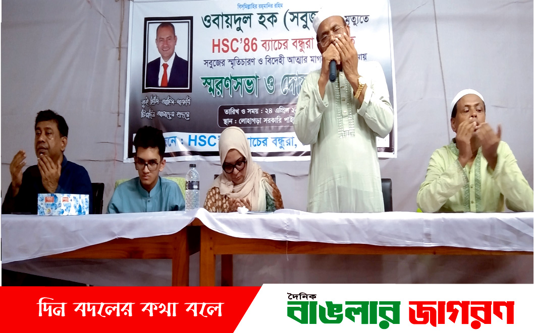 নড়াইলের লোহাগড়া উপজেলার লোহাগড়া কলেজপাড়া নিবাসী মরহুম ওবায়দুল হক সবুজের মৃত্যুতে স্মৃতিচারণ ও বিদেহী আত্মার মাগফিরাত কামনায় স্মরণসভা ও দোয়া মাহফিল অনুষ্ঠিত হয়েছে। শুক্রবার (২৪ এপ্রিল) বিকেল ৪ টার দিকে লোহাগড়া সরকারি পাইলট উচ্চ বিদ্যালয় অডিটোরিয়ামে এইচএসসি ৮৬ ব্যাচের আয়োজনে স্মরণসভা ও দোয়া অনুষ্ঠিত হয়।
